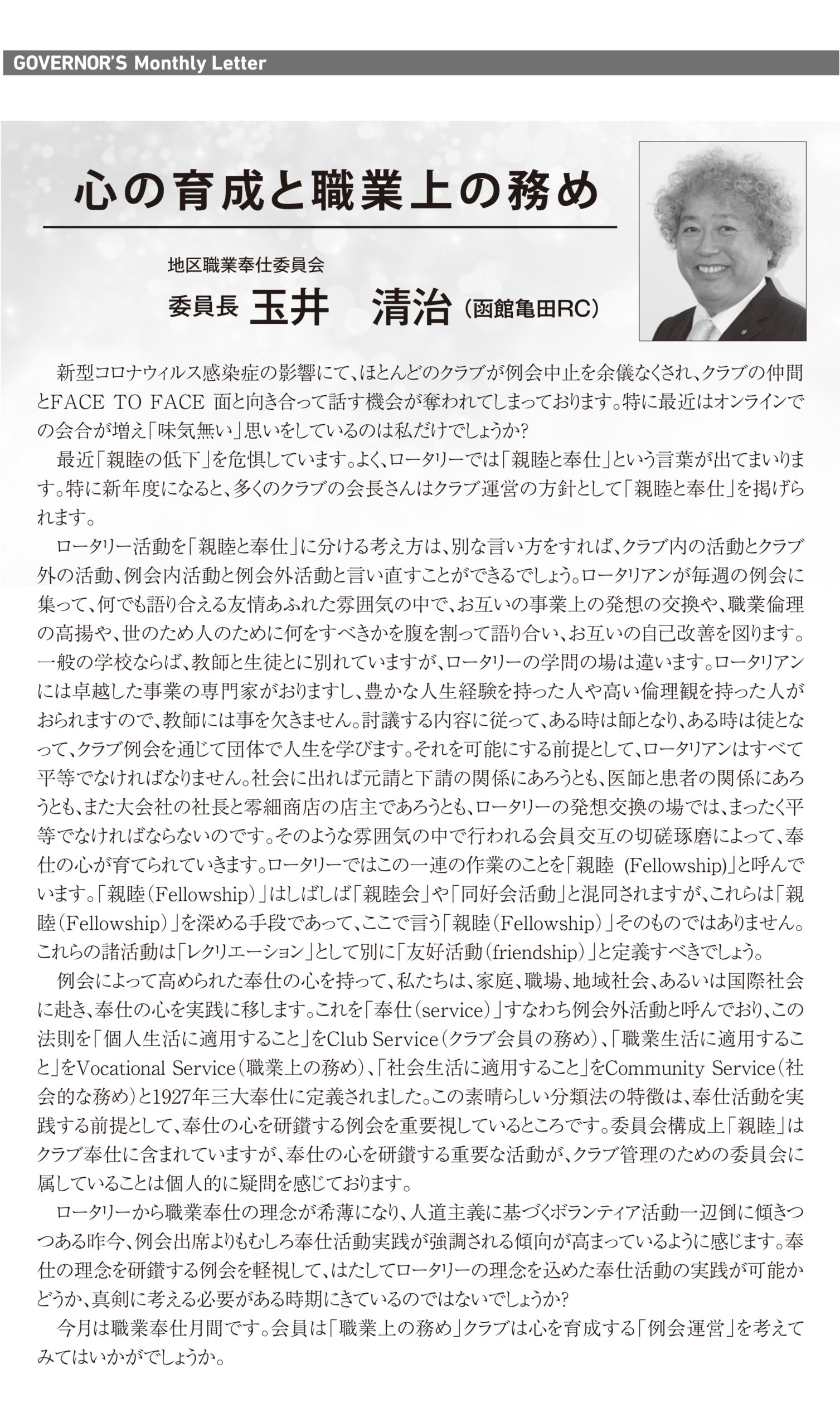 心の育成と職業上の務め(ガバナー月信1月号)