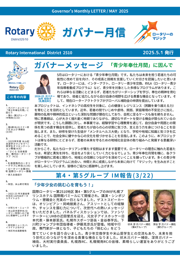 ガバナー月信5月号をお送りします。クラブ運営の一助となれば幸いです。