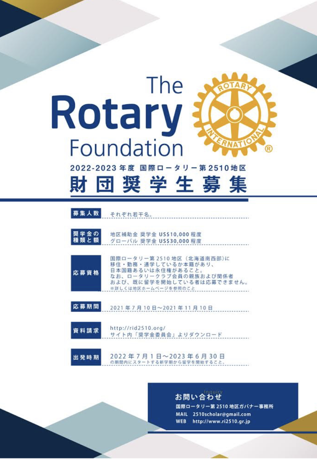 2020-23 「グローバル奨学生」「地区補助金奨学生」の募集ポスターが各クラブ、地区内大学に送付されます。