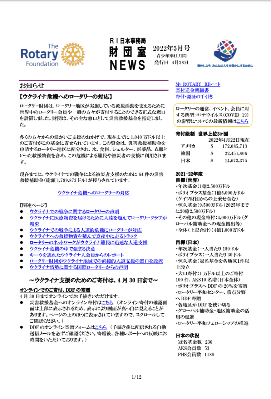 皆様のクラブにおいて、ロータリーの補助金、プログラムへの参加、寄付増進等にお役立ていただければ幸いです。