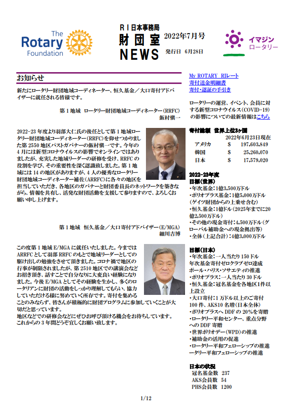 各クラブのロータリーの補助金、プログラムへの参加、寄付増進等にお役立ていただければ幸いです。