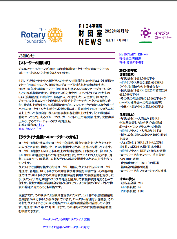 各クラブのロータリーの補助金、プログラムへの参加、寄付増進等にお役立ていただければ幸いです。