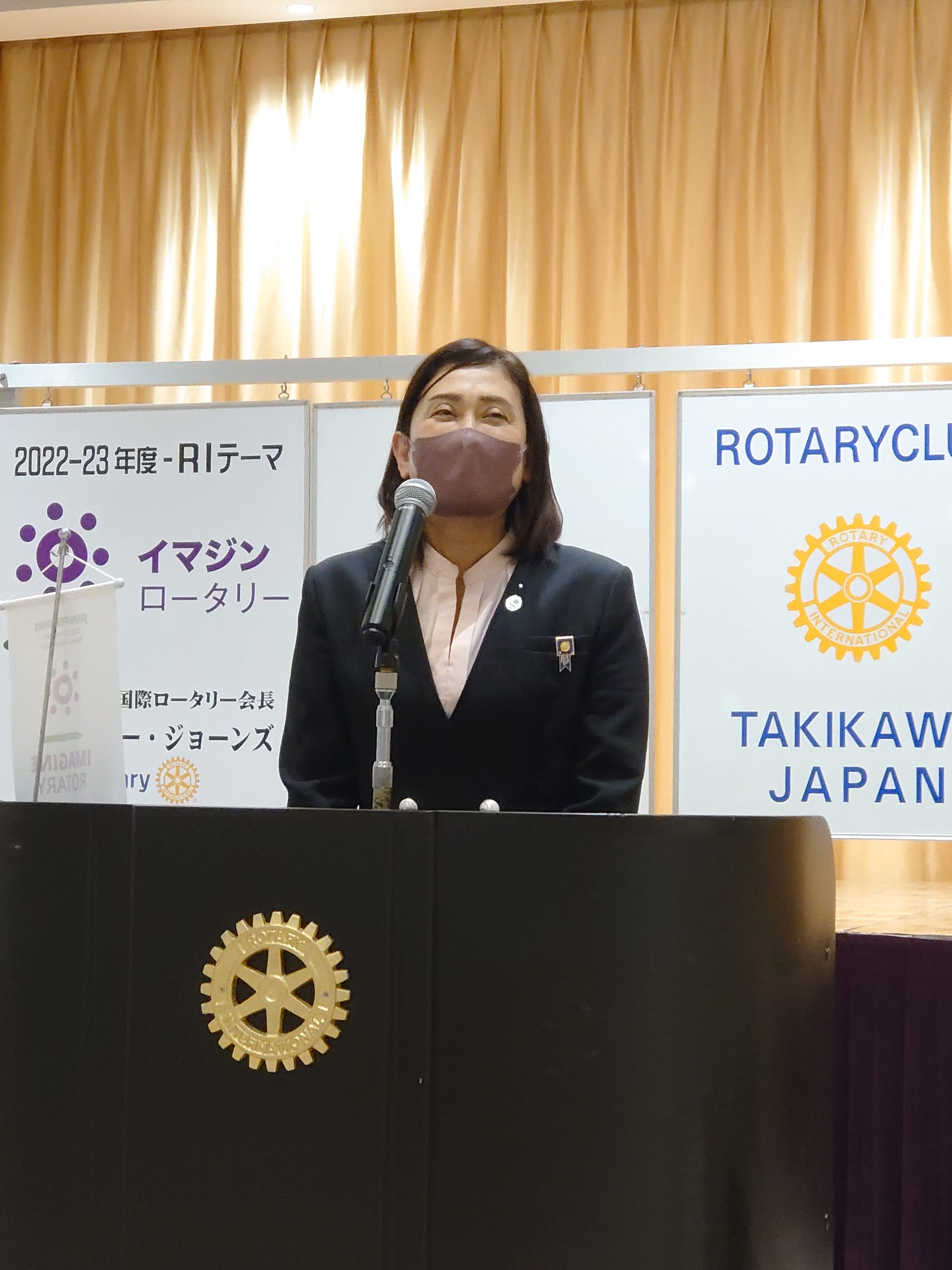 去る11月10日(木)の滝川ロータリークラブの例会にて、国際ロータリー第2510地区 2022-23 ガバナーノミニー 出村 知佳子様をお迎えいたしまして、ロータリー財団についての知識と理解を深めようをテーマに卓話を拝聴いたしました。