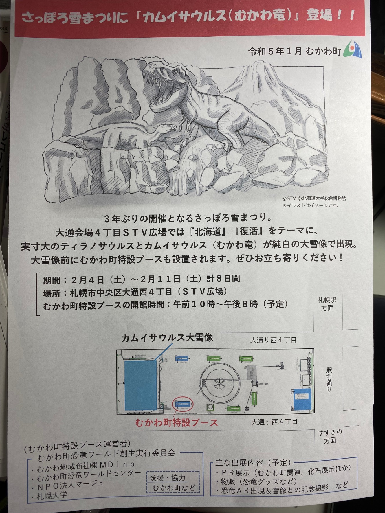 昨日の2月8日、胆振東部地震の被災三町への最終支援事業に向けてむかわ町役場を訪問した際、先方担当者様より、むかわ町穂別地区で発掘された「カムイサウルス(むかわ竜)」が大通会場4丁目STV広場大雪像であること、また、大雪像前には「むかわ町特設ブース」を出展していることについて「是非、宣伝してください」とのお願いがあり、支援活動の一環としてお知らせし紹介するものです。