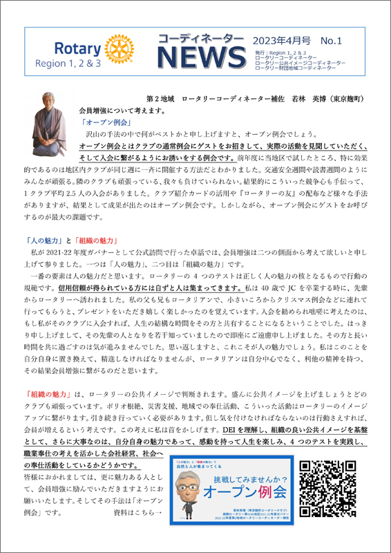 国際ロータリー日本事務局発行のコーディネーターニュース 2023年4月号が公開されました。