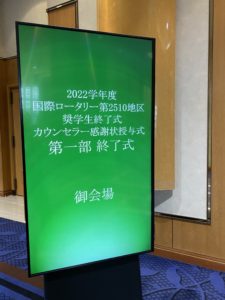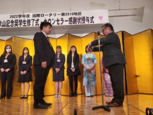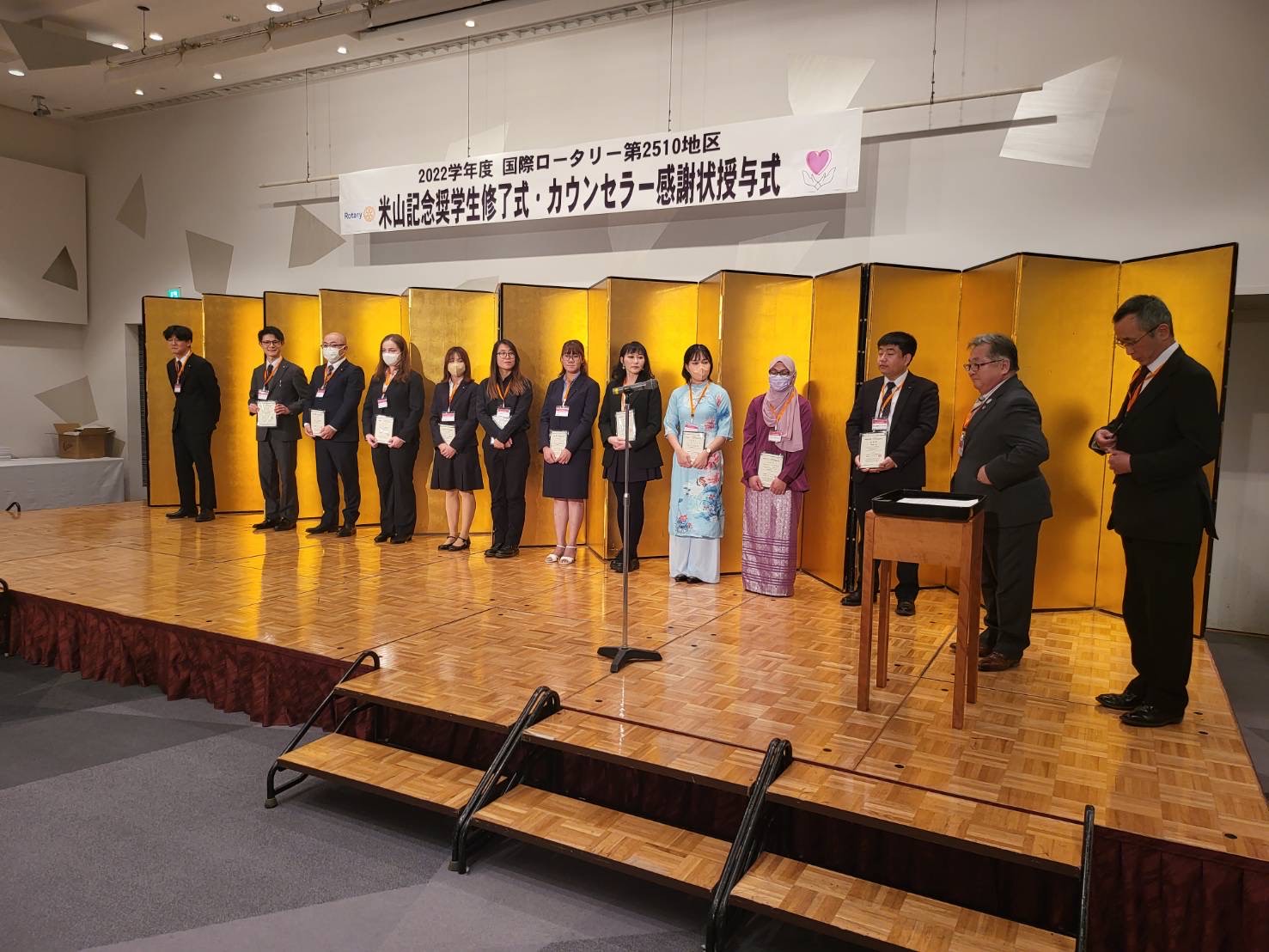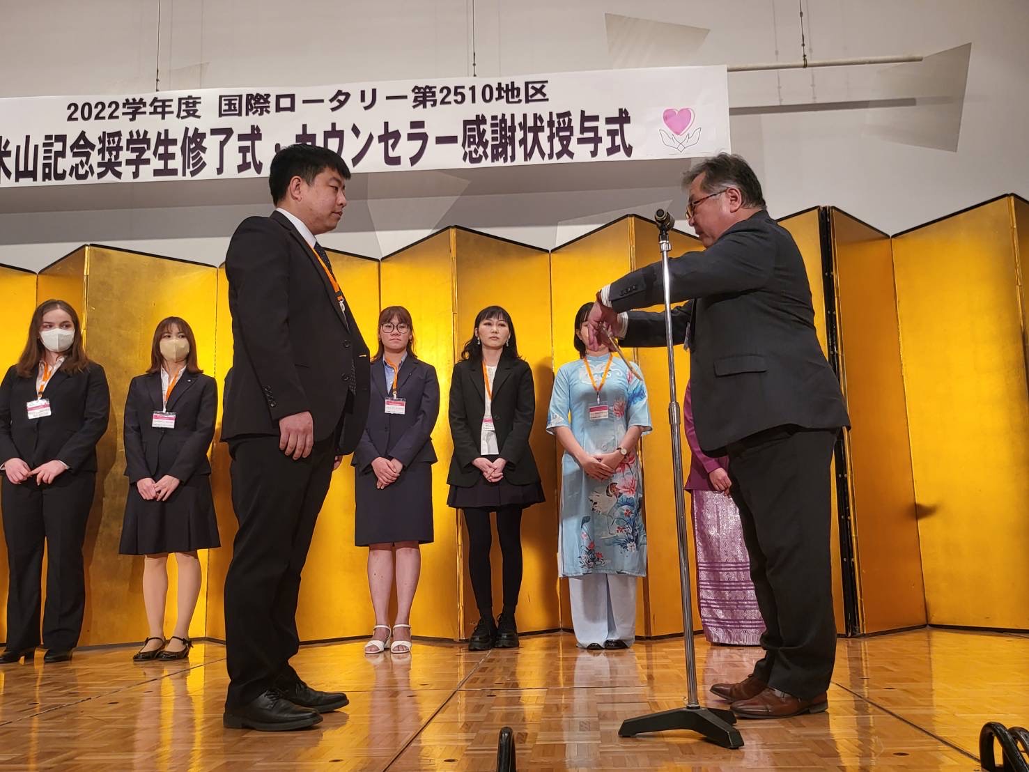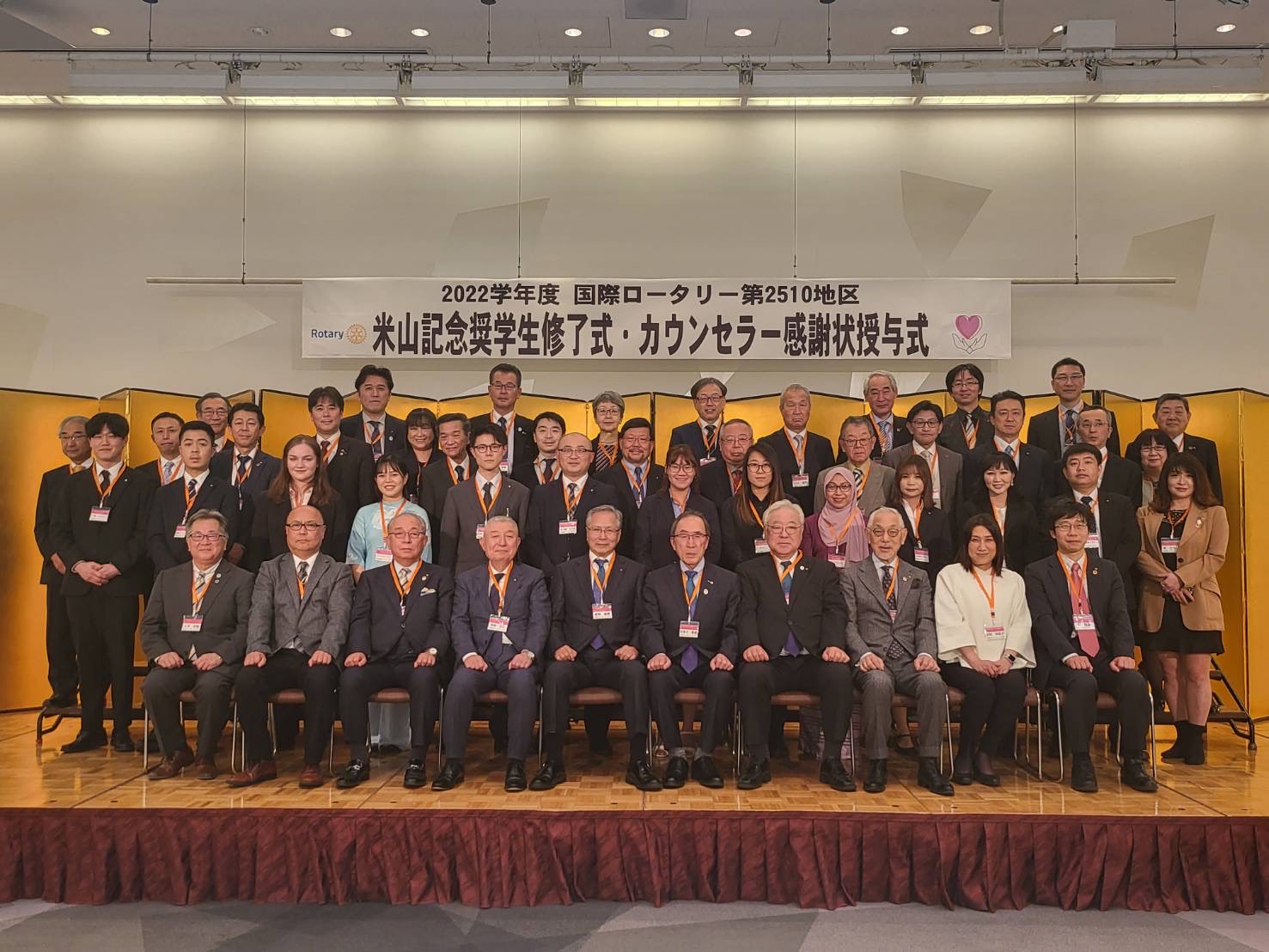 2023年3月21日 ロイトン札幌にて2022学年度米山記念奨学生終了式及びカウンセラー感謝状授与式を行いました 奨学生14名の出席、カウンセラー13名のご出席 ご来賓に公益財団法人 ロータリー米山記念奨学会 理事 嵯峨義輝 パストガバナー 同じく評議員 安孫子建雄パストガバナー 同じく財務委員 福井敬悟パストガバナーをお迎えし行われました 歓送懇親会では、奨学生お一人おひとりから想い出話を頂いたりし盛大に行われました。