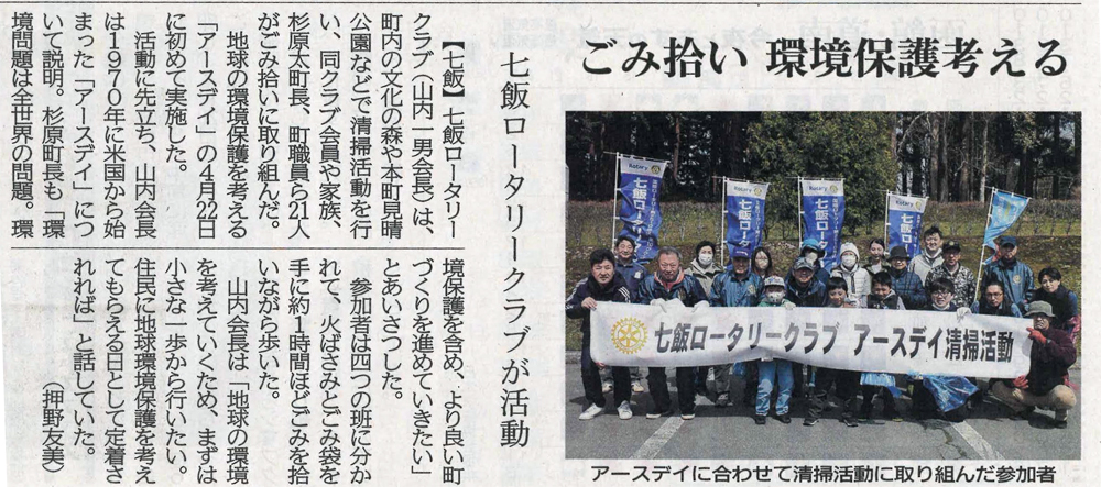 2023年4月22日、七飯RCがアースデイに実施した清掃活動が新聞に掲載されましたのでご紹介いたします。