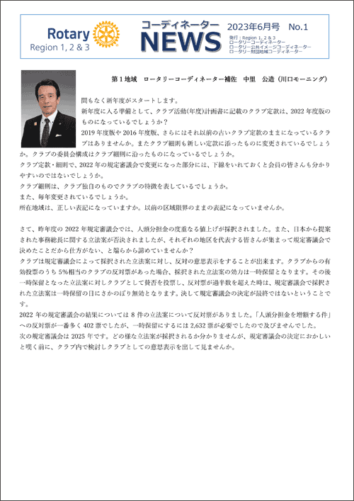 国際ロータリー日本事務局発行のコーディネーターニュース 2023年6月号が公開されました。