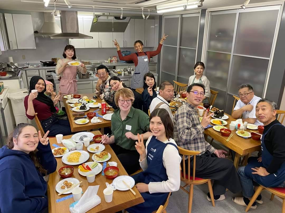 2023年11月12日(日)星澤クッキングスタジオで、新企画学友交流イベント「Let’s enjoy cooking!」を開催しました。現在滞在中の青少年交換学生、米山奨学生を対象にROTEX、米山学友、財団学友、ロータリアンが一緒に家庭料理を作り、おしゃべりを通じて交流を深める楽しい会となりました。日本語が堪能な米山奨学生が通訳してくれたり、みんなでサポートし合ったり、7か国(アメリカ、ドイツ、中国、韓国、マレーシア、ベトナム、日本)がひとつになりました。メニューはおにぎり、豚汁、卵焼き、ザンギ、生野菜のバーニャカウダ。学生たちは楽しそうに卵焼きに初挑戦したり、おにぎりを握っていました。デモンストレーションは、プロの調理師さんの富岡豊国際奉仕・VTT副委員長が務めてくださり、プロの技を披露してくださいました。プログラムの枠を超えて交流を深めることで、ロータリーへの理解を深めてもらえたらうれしいです。ご尽力くださったロータリアンの皆様、ご参加くださった皆様、どうもありがとうございました。