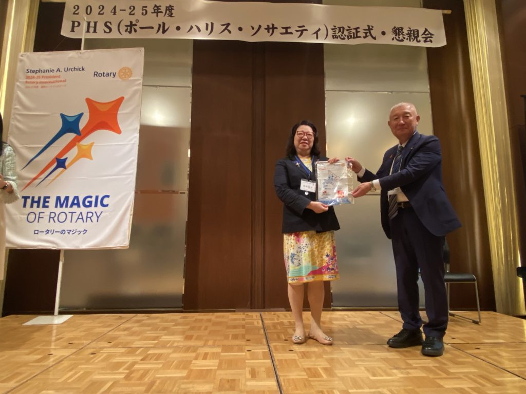 認証式では、4名のPHS新会員を代表して拝田昇会員(小樽南ロータリークラブ)に認証状が、メジャードナーレベルアップをされた5名を代表してレベル3の江本勝典会員(岩見沢ロータリークラブ)、PHS継続認証者29名を代表して髙野園子会員(札幌真駒内ロータリークラブ)、冠名基金設立者の出村知佳子ガバナー(札幌北ロータリークラブ)に記念品が贈呈されました。