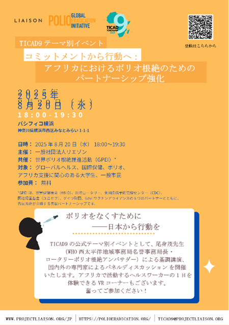 ●参加費:無料 ●参加申込リンク:https://www.projectliaison.org/jp/ticad9-polio-side-event