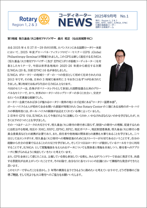 国際ロータリー日本事務局発行のコーディネーターニュース 2025年9月号が公開されました。