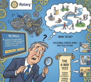 また、「職業奉仕ってどんなことをしたらいいのだろう?」という問いに対して、「職業奉仕入門」では具体的な実践事項例が示されています.そして、職業や生活のあらゆる場面で倫理的行動を実践するための指標となるのが、「4つのテスト」であり、「ロータリアンの行動規範」であると明確に記載されています. したがって、現在の職業奉仕は決して難しいものではありません.