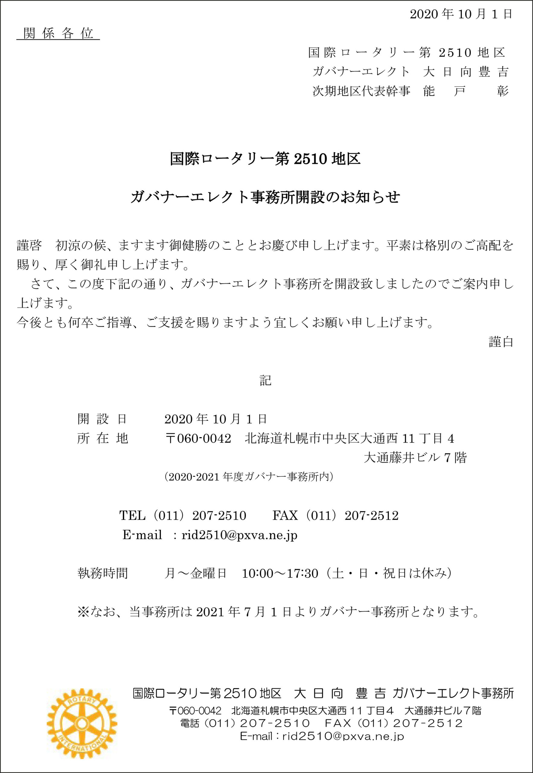 国際ロータリー第 2510 地区 ガバナーエレクト事務所開設のお知らせ