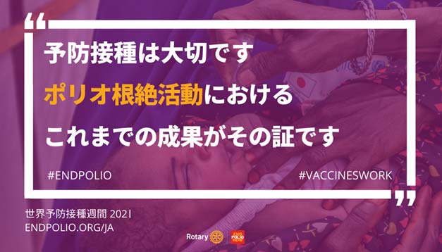 ポリオ根絶活動に携わってきた数十年の経験をもつロータリーの会員は、ワクチンの力を周知させる上で重要な役割を果たすことができます。 4月24~30日の世界予防接種週間は、命を救うワクチンの重要性についてクラブで認識を高め、コロナウイルスから人びとを守りつつ、ポリオ予防接種の継続的支援を呼びかける重要な機会となります。