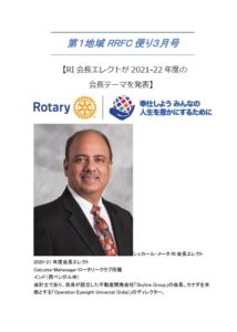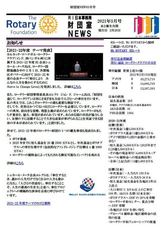「第1地域RRFC便り 3月号」 「財団室NEWS 3月号」をお送りいたします。皆様のクラブにて、ロータリーの補助金、プログラムへの参加、寄付増進等にお役立ていただければ幸いです。