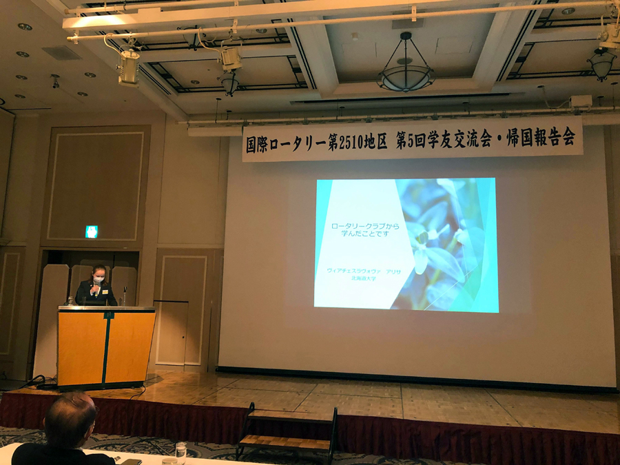 米山学友からの体験報告として、ヴィアチェスラヴォヴァ・アリサさん(ロシア出身・北海道大学大学院/お世話クラブ:札幌幌南RC)が「私がロータリークラブから学んだこと」を発表しました。